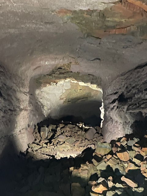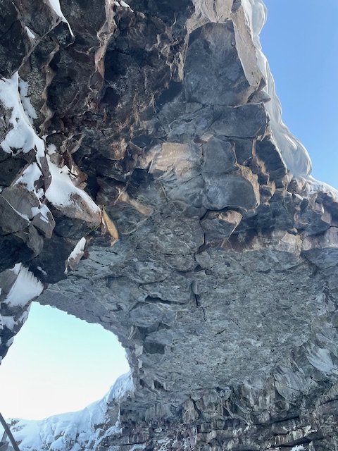 On one of our day tours, the Silver Circle, we visited Viðgelmir, one of the larger caves created from lava flow in Iceland. Prior to entering the cave we were given helmets with head lamps on them and were told ahead of time to wear hiking boots. There was only one entrance to the cave and we walked down many wooden steps to enter the cave. Once we descended into the cave there was one small section where there was a narrow gap to walk through.