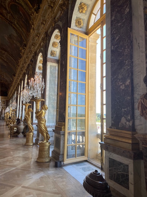 Probably the most famous room at Versailles is the Hall of Mirrors. It’s truly amazing and awe inspiring. There are 17 arched windows on one side. Across from each of the windows on the opposite side of the room are 17 mirrors. Throughout the room is marble, chandeliers, exquisite paintings on the ceiling, statues — utterly a room that takes your breath away. There’s a short video clip of the Hall of Mirrors directly below.